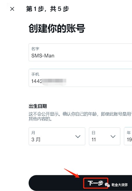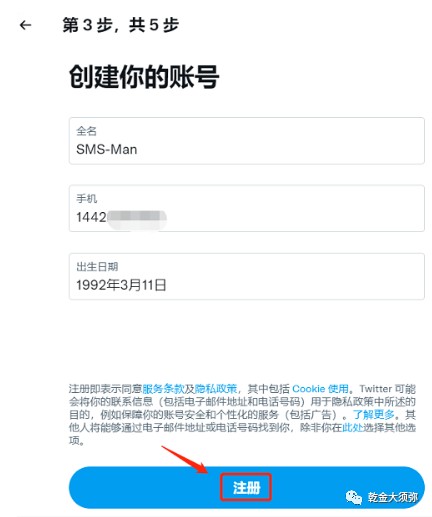 4、确认您的用户名、手机号、出生日期,然后点击【注册】按钮;