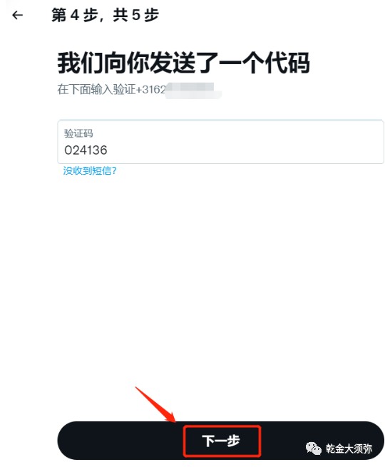 6、收到验证码后立即输入验证码,点击【下一步】;