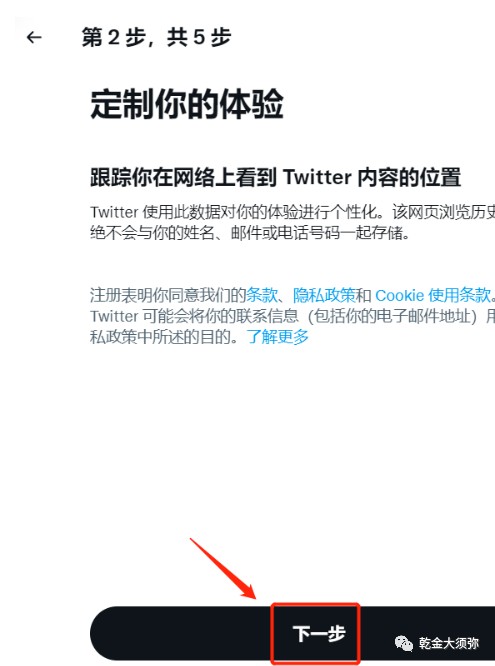 3、根据喜好选择推特跟踪您的电子足迹以便指定个性化内容,然后点击【下一步】的按钮;